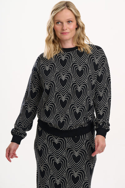 Make a bold statement with the Gerri Jersey Jacquard Top. This eye-catching long-sleeved jersey features an all-over layered heart pattern in a striking monochrome palette. Crafted from soft jacquard fabric, it offers a relaxed fit with ribbed cuffs, hem, and neckline for comfort and shape retention. Perfect for adding personality to your everyday wardrobe, this versatile top pairs effortlessly with jeans or skirts for a standout casual look. Pair with the matching Faith Jersey Jacquard Midi Skirt for a cute and cozy set.