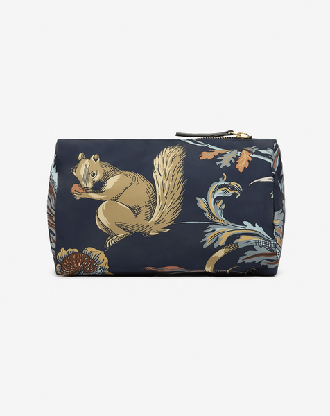 Lightweight, flexible, and functional, the Small Rococo Case in Navy Blue is crafted from recycled polyester technical fabric that adapts to any volume. This charming case features a Rococo-inspired print of squirrels in light yellow, blue, and brown against a navy background. Finished with 100% leather and a secure zipper closure, it’s a stylish and practical accessory for organizing your essentials.