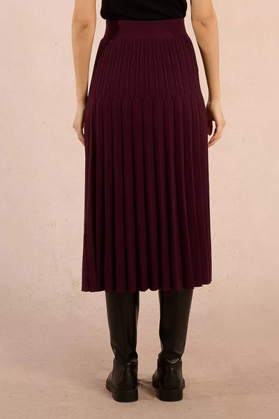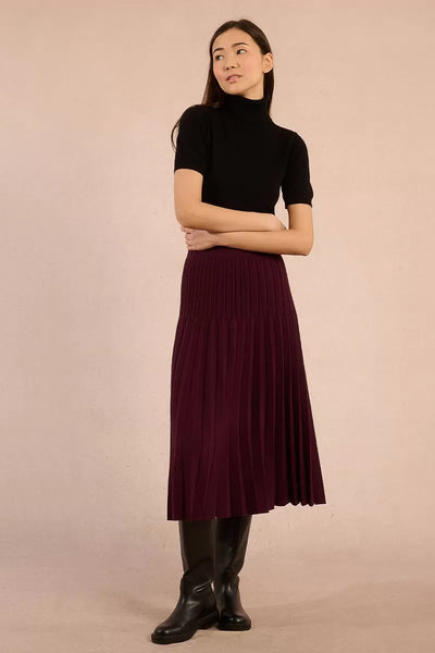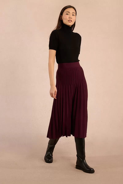 This stretchy skirt features a high waist with an elastic band and is fitted through the waist and hips falling into a pleated skirt. Our clients love this versatile style so much so we had to bring it back this year in this deep burgundy colorway.