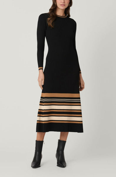 Chic and versatile, the Landon Dress in Jet/Beige/Camel combines sleek structure with playful detail. The fitted ribbed knit bodice and long sleeves create a streamlined silhouette, while the flared skirt in striped beige and camel adds movement and contrast. Tonal stripe accents at the neckline, cuffs, and hem tie the look together with understated elegance. Falling to a midi length and unlined for lightness, this dress transitions seamlessly from day to evening.