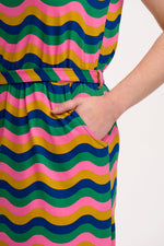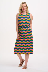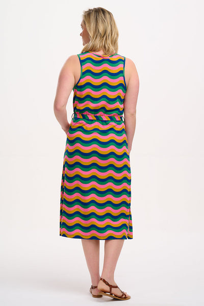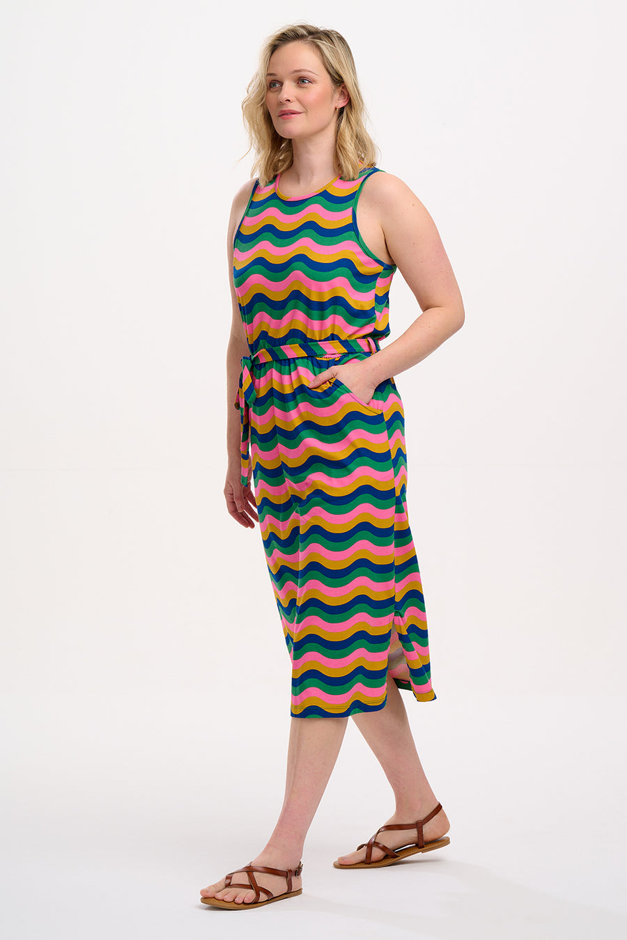 A colorful jersey dress, made for grey days from our friends at Sugarhill Brighton in England. Cut from thicker, soft 100% cotton the Rory features a sleeveless straight silhouette, a matching tie belt and handy pockets, on a midi-length skirt.
