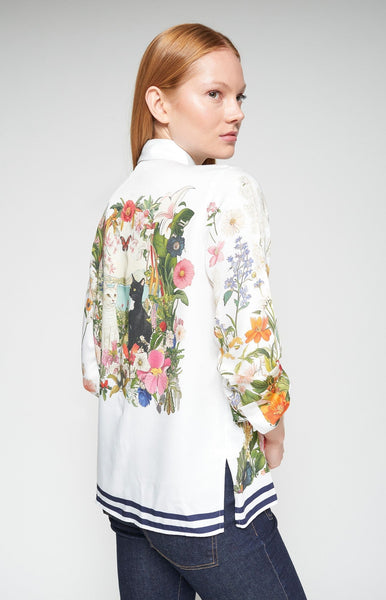 Delight in the whimsical charm of the Tea Blouse in White Gatos Print. Crafted from soft viscose, this relaxed-fit blouse features a multicolor floral design across the sleeves, front, and back, with a central back illustration of two cats surrounded by blooms. Classic shirt collar and front button closure keep the look timeless, while long sleeves with buttoned cuffs and a straight hem with side slits add effortless wearability. Navy-striped borders on the hem and cuffs provide a subtle, stylish contrast.