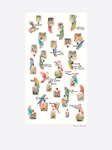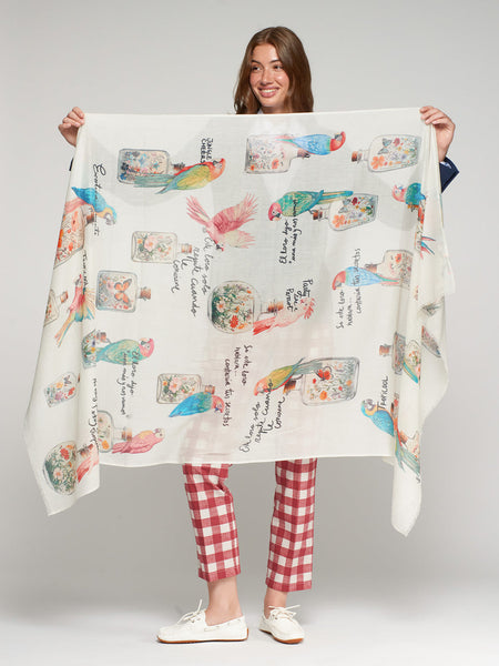 The Tropical Fragrance Scarf in Parrot by Vilagallo is a vibrant, whimsical accessory. Set on a soft cream background, it features colorful parrot illustrations paired with vintage floral perfume bottles for a playful, tropical-inspired look. This large 180 × 100 cm rectangular scarf is crafted from a soft cotton-modal blend, offering lightweight drape and effortless style for layering over any outfit.
